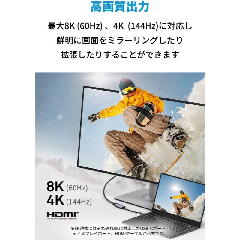 HDMIを搭載するさまざまなテレビやディスプレイに接続することで、8K (60Hz) または4K (144Hz) の高画質コンテンツをお楽しみいただけます。幅広い対応機種