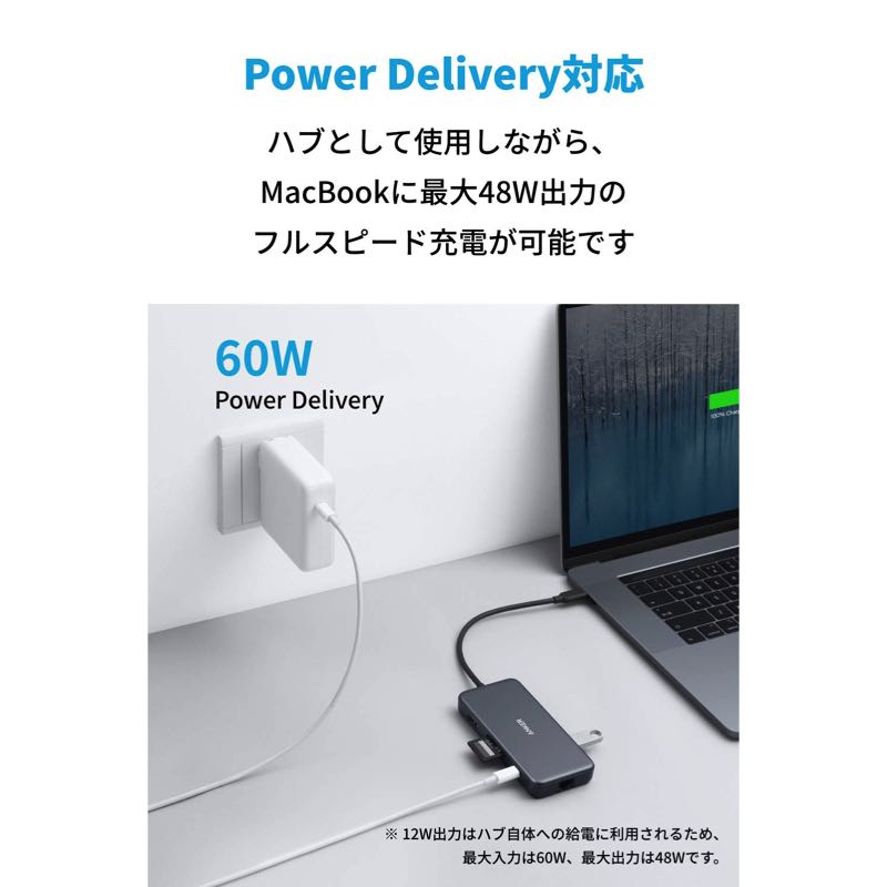 データ転送やHDMI接続などハブとして使用しながらも、MacBookに最大48Wまでの高出力でフルスピード充電が可能です (12W出力はハブ自体への給電に利用されます)。