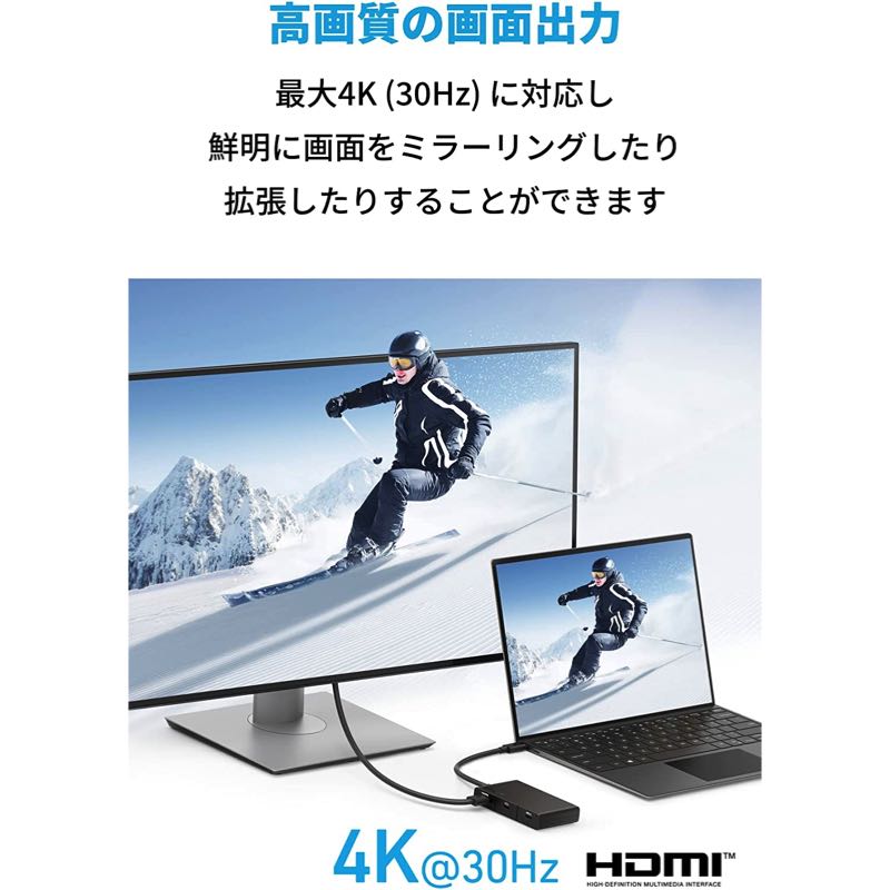 HDMIポートを使用して、最大4K (30Hz) の画像出力が可能です。鮮明に画面をミラーリングしたり拡張したりすることができます。パススルー急速充電