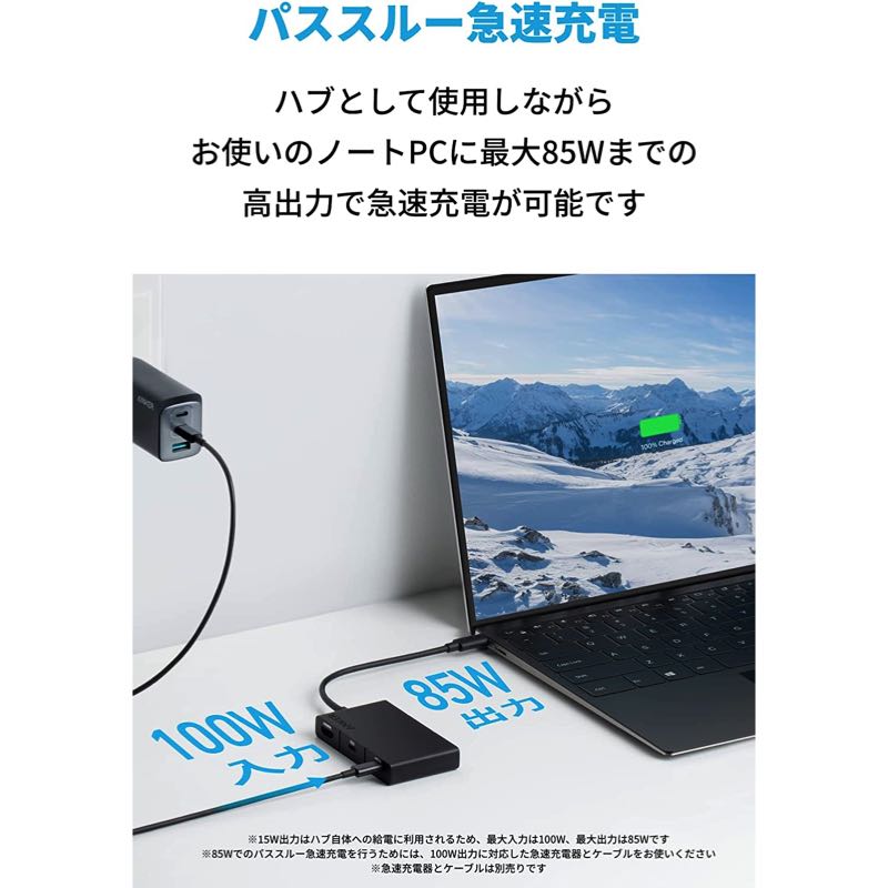 データ転送やHDMI接続などハブとして使用しながら、お使いのノートPCに最大85Wまでの高出力でパススルー急速充電が可能です。※85Wでのパススルー急速充電を行うためには、100W出力に対応した急速充電器とケーブルをお使いください。なお、急速充電器とケーブルは別売りです。製品比較表