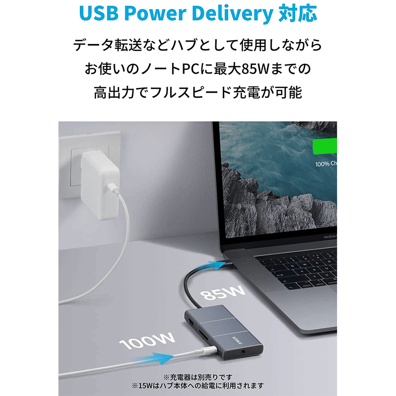 データ転送などハブとして使用しながら、お使いのノートPCに最大85Wまでの高出力でフルスピード充電が可能です。高画質出力