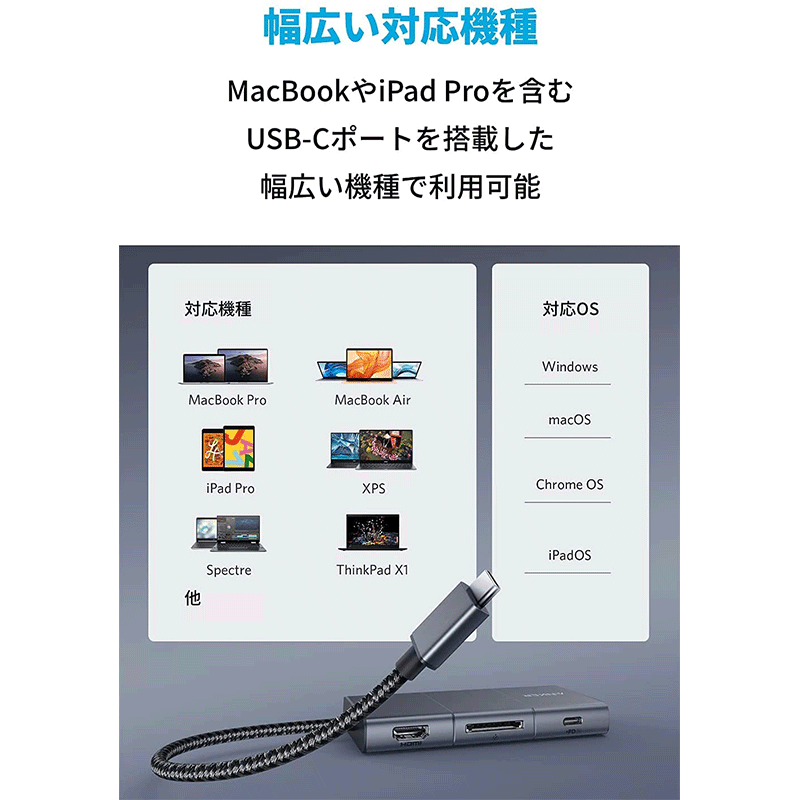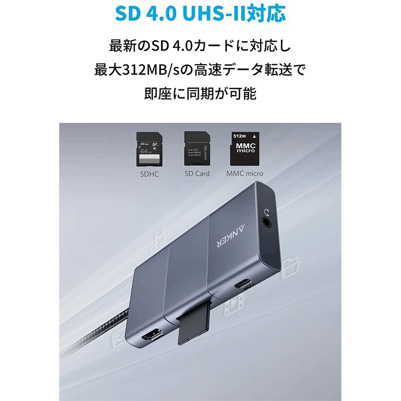 フルスピード充電が可能なUSB Power Deliveryに対応したUSB-Cポート、2つのデータ転送用USB-Aポート、4K (60Hz) 対応のHDMIポート、SDカードスロット、3.5mmオーディオジャックへの接続が1つのハブで可能になりました。高速データ転送