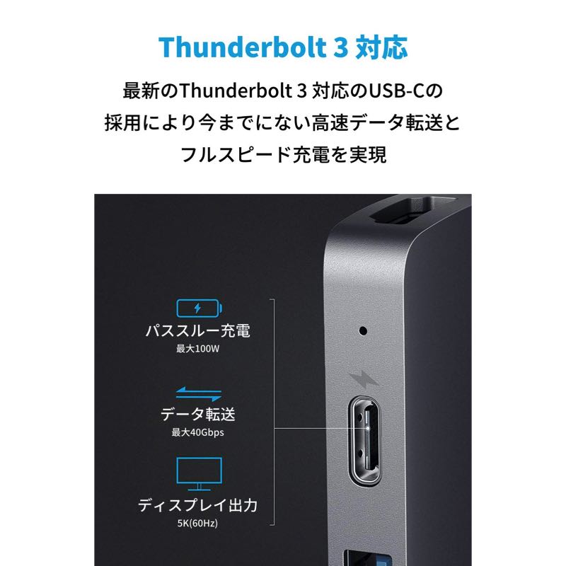 | USB-C ポート数 | 2 (多機能USB-C × 1、データ転送用 × 1) | 3 (Macbook Air / Pro専用コネクタ × 1、多機能USB-C × 1、USB PD対応充電用 × 1) | 1 (USB PD対応充電用 × 1) | 2 (USB PD対応充電用 × 1、データ転送用 × 1) | 2 (USB PD対応充電用 × 1、3.2 Gen1 × 1) |