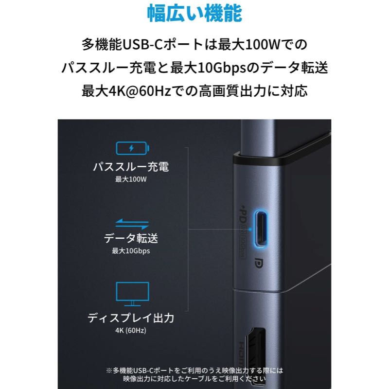 | USB-C ポート数 | 3 (Macbook Air / Pro専用コネクタ × 1、多機能USB-C × 1、USB PD対応充電用 × 1) | 2 (多機能USB-C × 1、データ転送用 × 1) | 1 (USB PD対応充電用 × 1) | 2 (USB PD対応充電用 × 1、データ転送用 × 1) | 2 (USB PD対応充電用 × 1、3.2 Gen1 × 1) |