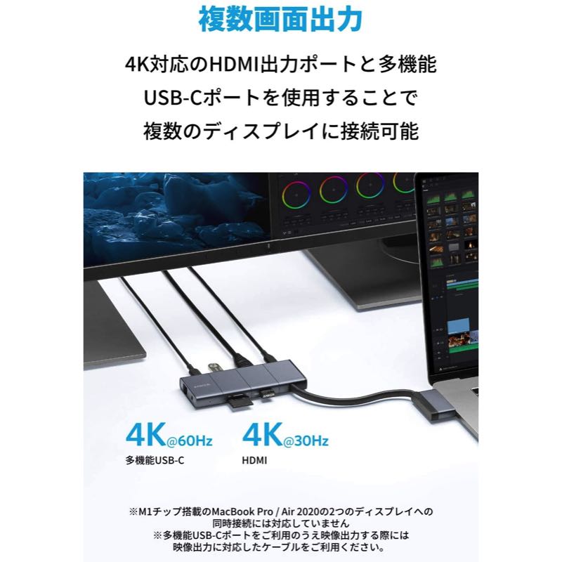 最大4K@30Hz対応のHDMI出力ポートと4K@60Hz対応の多機能USB-C ポートを搭載し、複数のディスプレイに接続することが可能です。(※本製品はM1チップ搭載のMacbook Air / Pro 2020 の2つのモニターへの同時接続には対応していません。1つのモニターにのみ出力可能です。※多機能USB-Cポートをご利用のうえ映像出力する際には映像出力に対応したケーブルをご利用ください。)