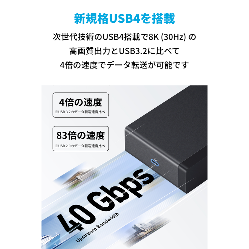 次世代技術のUSB4を搭載し、40Gbpsのアップストリーム帯域幅をより効率的に使用することが可能です。8K (30Hz) の高画質出力とUSB3.2に比べて4倍の速度でデータ転送が可能です。充電はこれ1つ