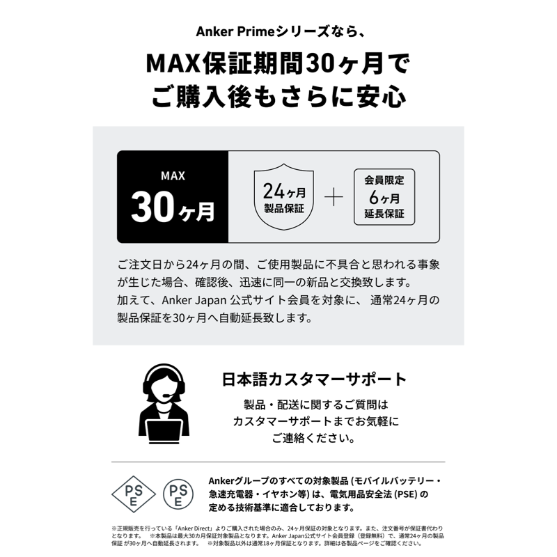 | パッケージ内容 | Anker Prime ドッキングステーション (14-in1, 8K, Thunderbolt 5) 、Thunderbolt 5ケーブル (1.0m、140W、120Gbps)、安全に関する注意事項、24ヶ月保証 + 6ヶ月 (Ankerで会員登録後) 、カスタマーサポート |