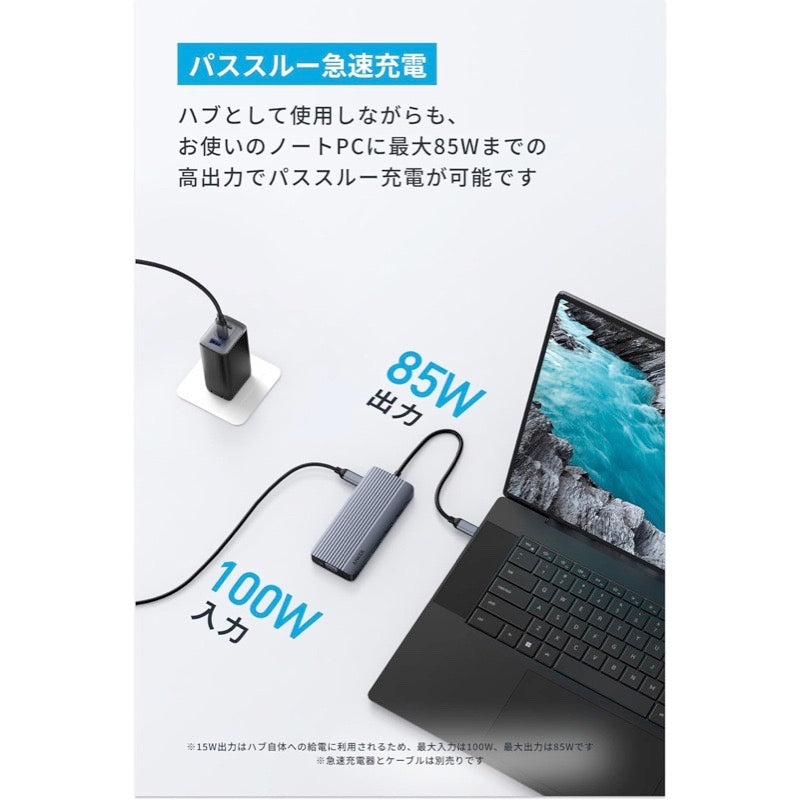 データ転送やHDMI接続などハブとして使用しながらも、お使いのノートPCに最大85Wまでの高出力でパススルー急速充電が可能です。※85Wでのパススルー急速充電を行うためには、100W出力に対応した急速充電器とケーブルをお使いください。なお、急速充電器とケーブルは別売りです。製品比較表