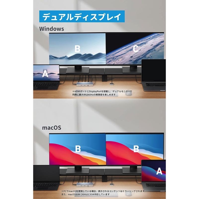 HDMIポートとDisplayPortを搭載し、デュアルモニターで同時に最大4K@60Hzの解像度を楽しめます。 (※macOSの場合、デュアルモニターで最大4K@30Hzの出力になる)9つのポートを1つに