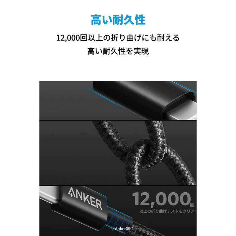 二重に編み込まれた高耐久性ナイロンに加え、様々な加工や保護技術を駆使してケーブルの耐久性を追求、高耐久性を実現しました。Anker製品の強み