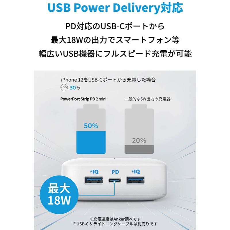 | パッケージ内容 | Anker PowerPort Strip PD 2 mini、取扱説明書、18ヶ月保証 + 6ヶ月、カスタマーサポート |