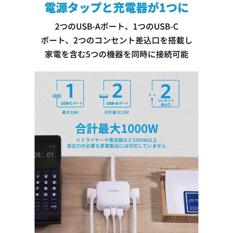 Anker PowerPort Strip PD 2 miniはコンセント差込口2口に加えUSB-Cポート1つとUSB-Aポート2つを搭載。ACコンセントで複数の家電を接続しながら、USBポートでお使いのUSB機器を充電できます。※本製品の合計最大出力は1000Wのため、ドライヤーや電気鍋など1000W以上高出力が必要な家電製品には対応していません。ほこり防止シャッター付き