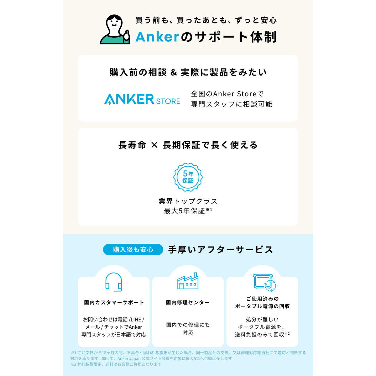 ※Anker Japan 公式オンラインストア会員を対象に、通常18ヶ月の製品保証を5年へ自動延長致します。特徴