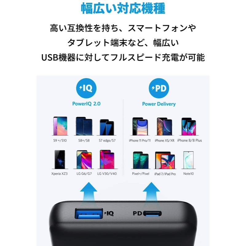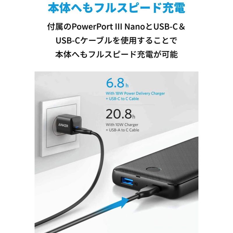 USB-AポートとUSB-Cポートの2つを搭載し、各ポート最大18Wのフルスピード充電が可能です。(2ポート同時に使用する場合は合計最大出力15Wとなります。)超大容量