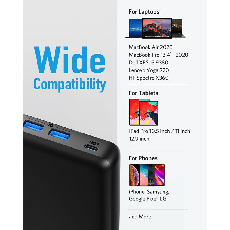 USB-Cポートは最大60Wの高出力に対応し、お使いのUSB-C対応のノートPCにフルスピード充電が可能。また、USB-Cポートと2つのUSB-Aポートから最大3つの機器へ同時に充電できます。ノートPC 約1回分充電可能
