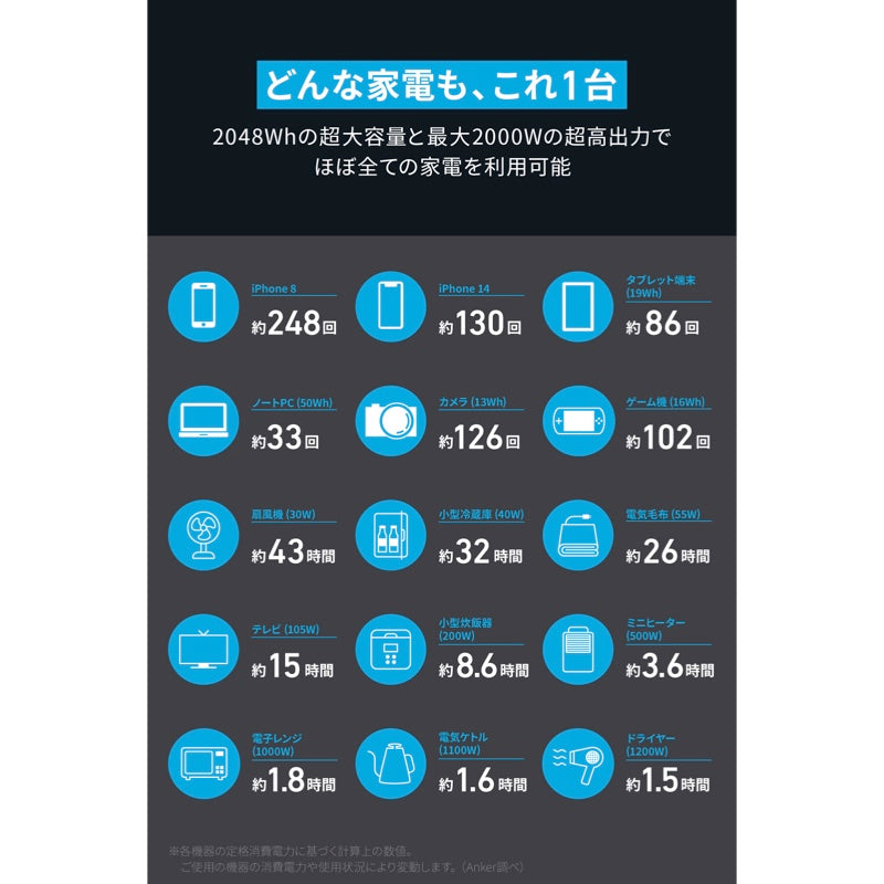 | 補足説明 | Anker 767 Portable Power Station (GaNPrime PowerHouse 2048Wh) 製品の仕様・注意点はこちら Anker Solix BP2600 拡張バッテリー (2560Wh) 製品の仕様・注意点はこちら |