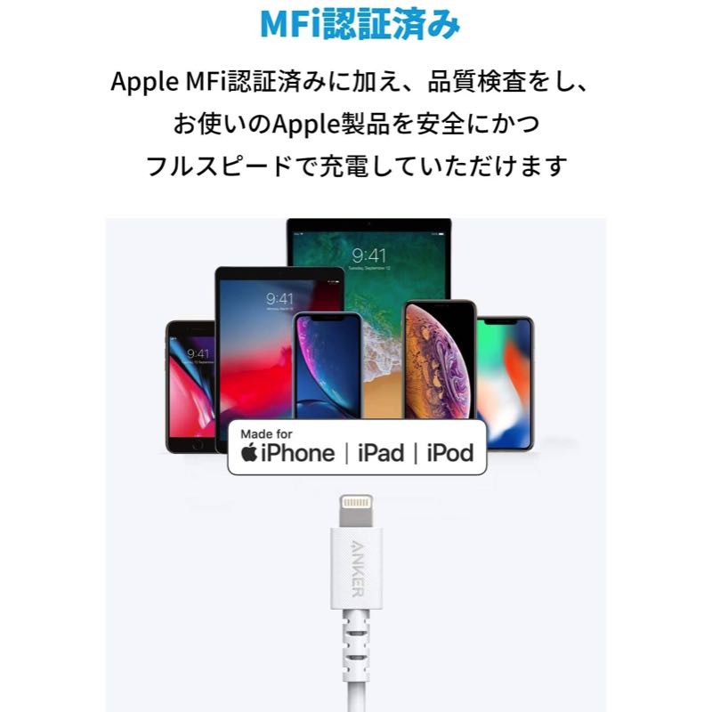 Apple MFi認証済みに加え、弊社による厳格な品質検査を実施しており、お使いのApple製品を安全にかつフルスピードで充電していただけます。