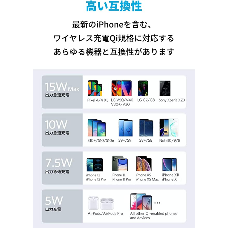 | 対応機種 | 15W出力対応 : - Xperia 1 III / IV - Xperia 5 IV 12W出力対応 : - Pixel 6 / Google Pixel 7/ Google Pixel 7Pro 10W出力対応 : - Galaxy S21 5G / + 5G - Galaxy S22 / S22 Ultra - Galaxy Z Fold3 5G / Flip3 5G / Flip4 / Fold4 7.5W出力対応 : - iPhone 14 / 14 Plus / 14 Pro / 14 Pro Max / iPhone 13 / 13 mini / 13 Pro / 13 Pro Max / iPhone 12 / 12 mini / 12 Pro / 12 Pro Max / 11 / 11 Pro / 11 Pro Max / SE (第2世代) / XS / XS Max / XR / X / 8 / 8 Plus 他 |