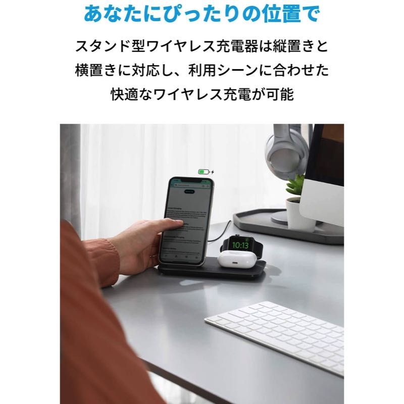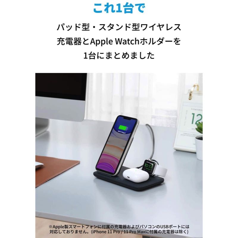 パッド型ワイヤレス充電器とスタンド型ワイヤレス充電器、Apple Watch ホルダーを1台にまとめました。お使いのスマートフォンやワイヤレス充電対応のイヤホン、Apple Watch、その他のQi対応機器を3台同時に充電することが可能です。(※Apple Watchホルダーをご利用の際は、純正のApple Watch磁気充電ケーブル (1m) (別売り) が必要です。)幅広い対応機種