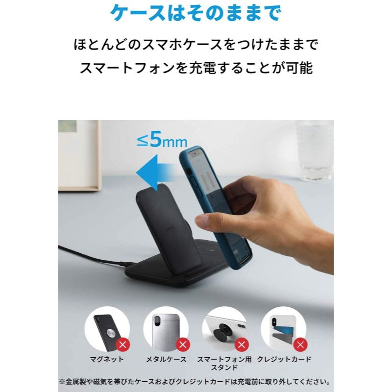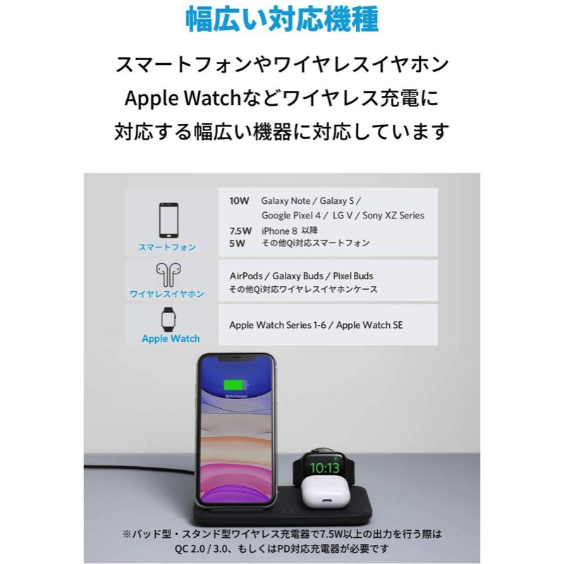 Apple Watchや、iPhone、Galaxyを含む各種Qi対応のスマートフォンや、Soundcore Liberty Air 2を含むワイヤレスイヤホン等、幅広い機器でワイヤレス充電が可能です。USB急速充電器付属