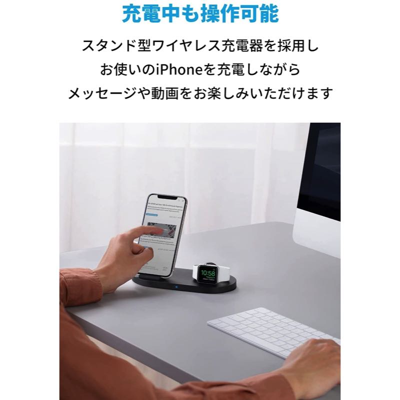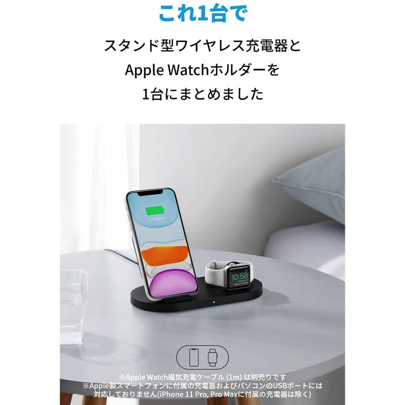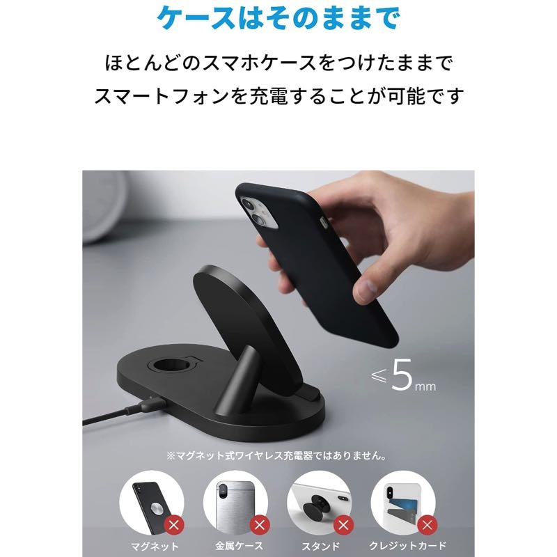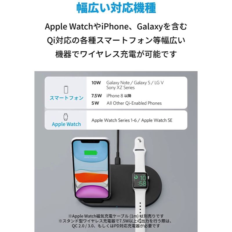 スタンド型ワイヤレス充電器とApple Watchホルダーを1台にまとめました。お使いのスマートフォンとApple Watchを2台同時に充電できます。 (※Apple Watchホルダーをご利用の際は、純正のApple Watch磁気充電 - USB-Aケーブル (1m) (別売り) が必要です。)幅広い対応機種