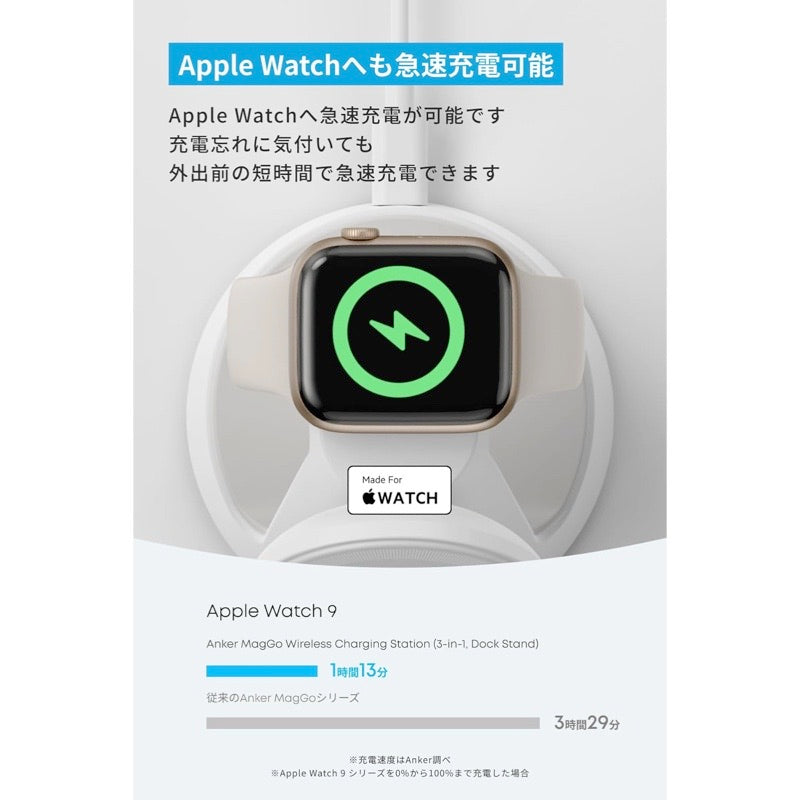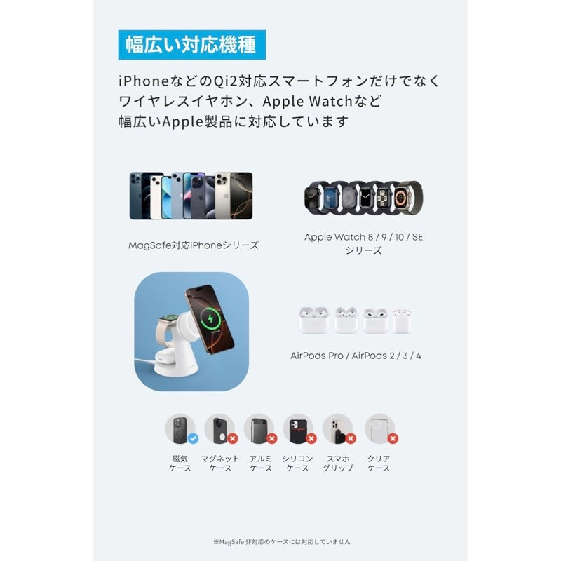 マグネット式ワイヤレス充電対応の3-in-1充電器。Qi2対応のiPhoneに従来のAnker MagGoシリーズの2倍の最大15W出力でワイヤレス充電が可能です。3台まとめてこれ1つ