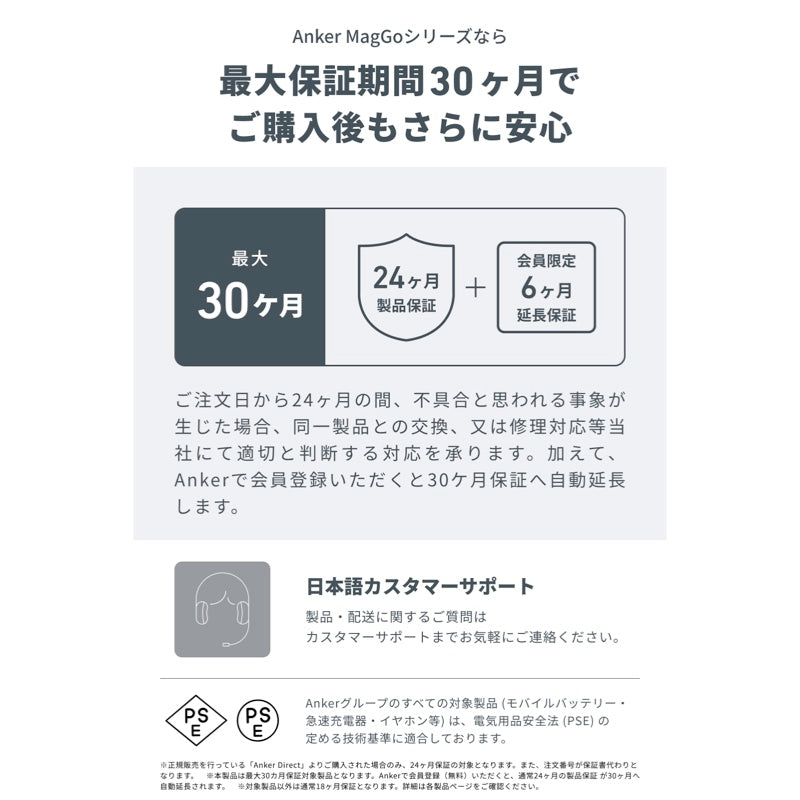 | パッケージ内容 | Anker MagGo Wireless Charging Station (3-in-1, Dock Stand)、40W USB PD充電器、 USB-C & USB-C ケーブル (1.5m) 、取扱説明書、24ヶ月保証 + 6ヶ月 (Ankerで会員登録後) 、カスタマーサポート |
