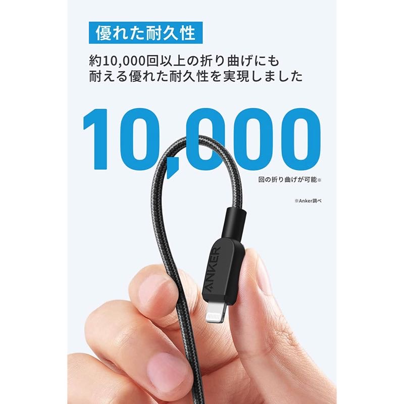 10,000回以上の折り曲げにも耐える優れた耐久性を実現しているため、ケーブル内部のワイヤーを断線から保護し、安心して充電することができます。Apple MFi認証取得