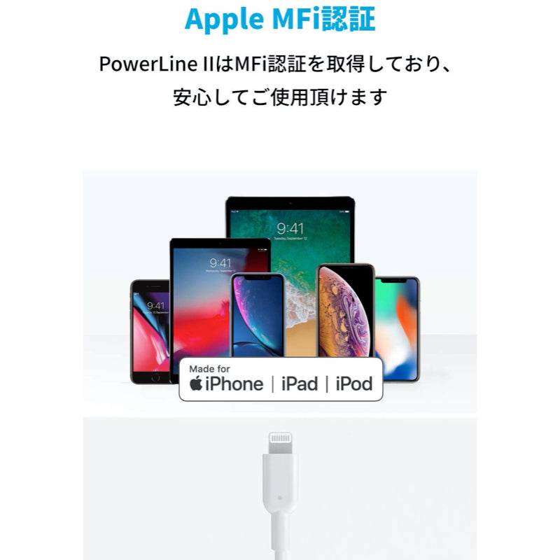 PowerLine IIはApple社に許可を受けた証であるMFi認証を取得しており、安心してご使用頂けます。 iPhoneやiPad、iPod、その他のLightning端子機器に対して最適に動作するよう設計されています。製品比較表