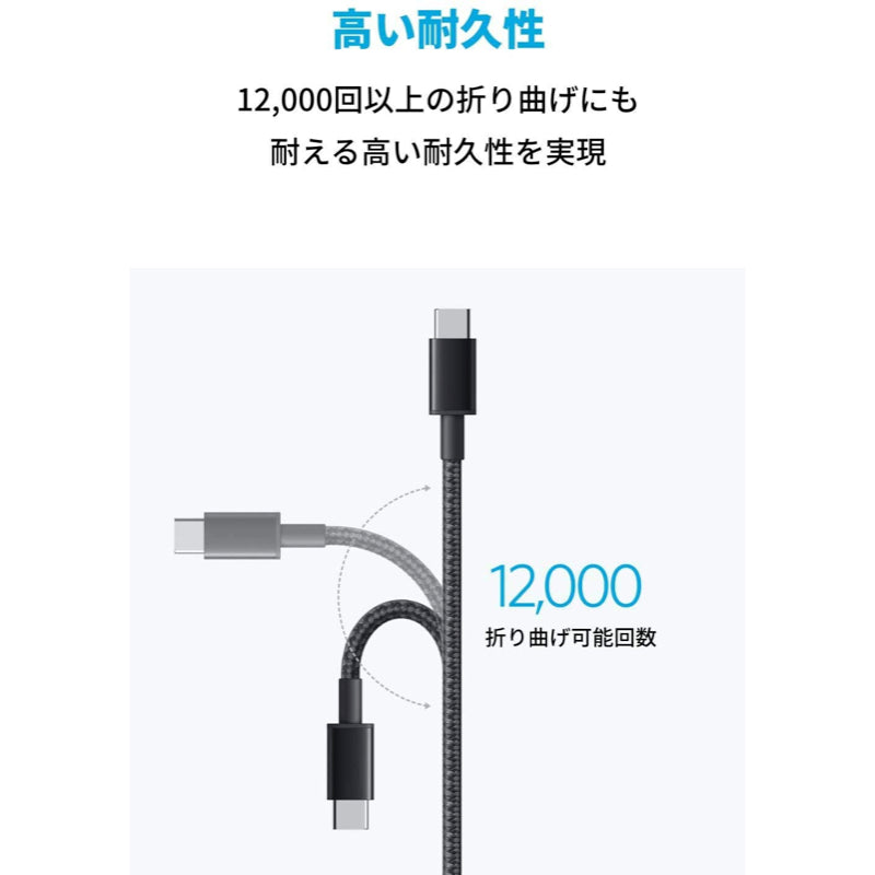 Anker 高耐久ナイロン USB-C&USB-C 2.0 ケーブルは、12,000回以上の折り曲げにも耐える高い耐久性を実現しました。プレミアム設計