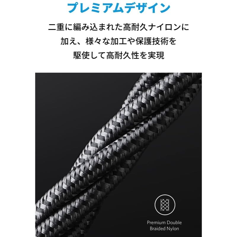 ケーブルに編み込み式の高耐久ナイロンを使用し、12,000回以上の折り曲げにも耐える優れた耐久性を実現しました。高い安全性