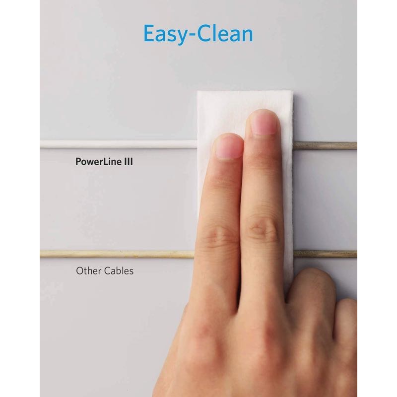 Anker PowerLine III ライトニングUSBケーブルが汚れたり、黄ばんだりしても心配ありません。表面には防塵加工が施されているため、汚れがついても濡れた布で拭くだけで新品同様の見た目に戻ります。特許取得の極細デザイン