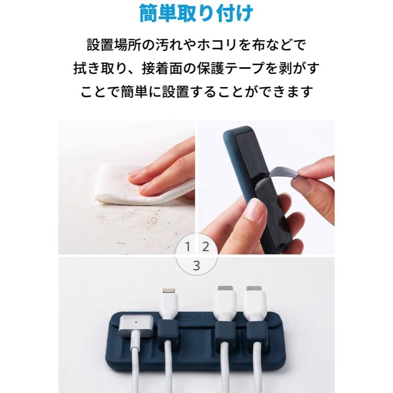 Anker Magnetic Cable Holderは3つのステップで簡単に取り付け可能です。