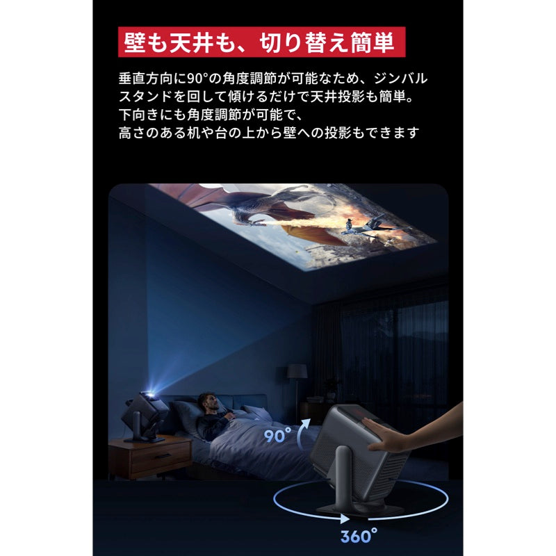 垂直方向に90°の角度調節が可能なため、ジンバルスタンドを回しながら傾けるだけで天井投影も簡単です。下向きにも角度調節が可能で、高さのある机や台の上から壁への投影もできます。