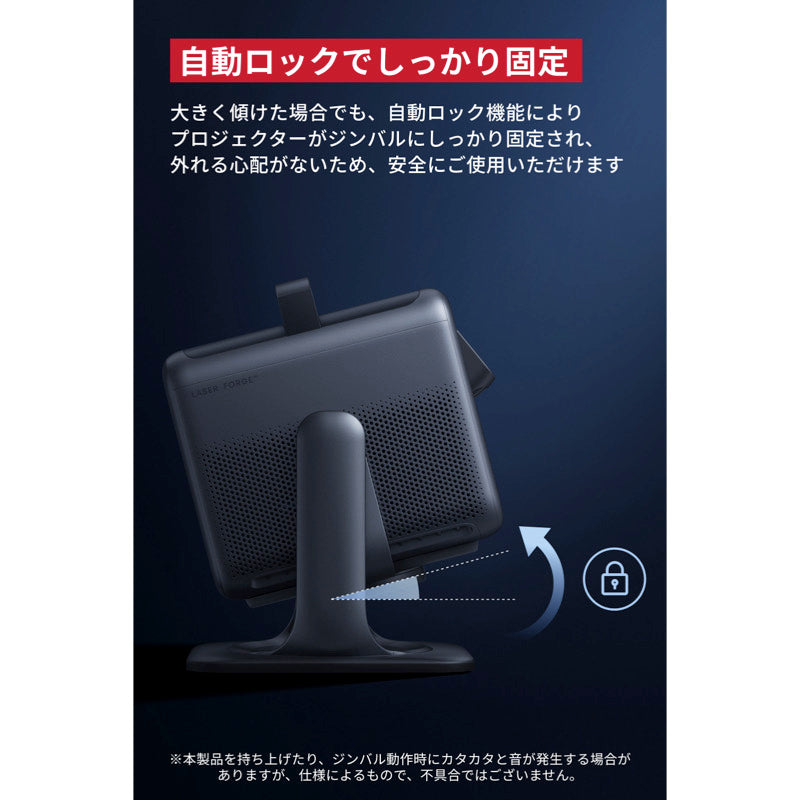 大きく傾けた場合でも、自動ロック機能によりプロジェクターがジンバルにしっかり固定され、外れる心配がないため、安全にご使用いただけます。※本製品を持ち上げたり、ジンバル動作時にカタカタと音が発生する場合がありますが、仕様によるもので、不具合ではございません。