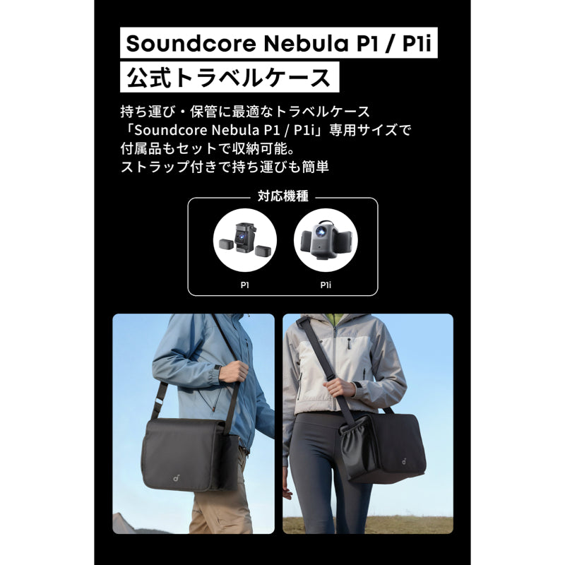 持ち運び・保管に最適なトラベルケース。「Soundcore Nebula P1 / P1i」専用サイズで付属品もセットで収納することができます。