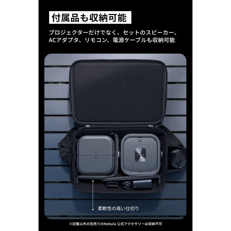 プロジェクターだけでなく、セットのスピーカー、電源ケーブルも収納いただけます。ストラップ付きで持ち運びも簡単です。※記載以外の別売りのNebula 公式アクセサリーは収納不可