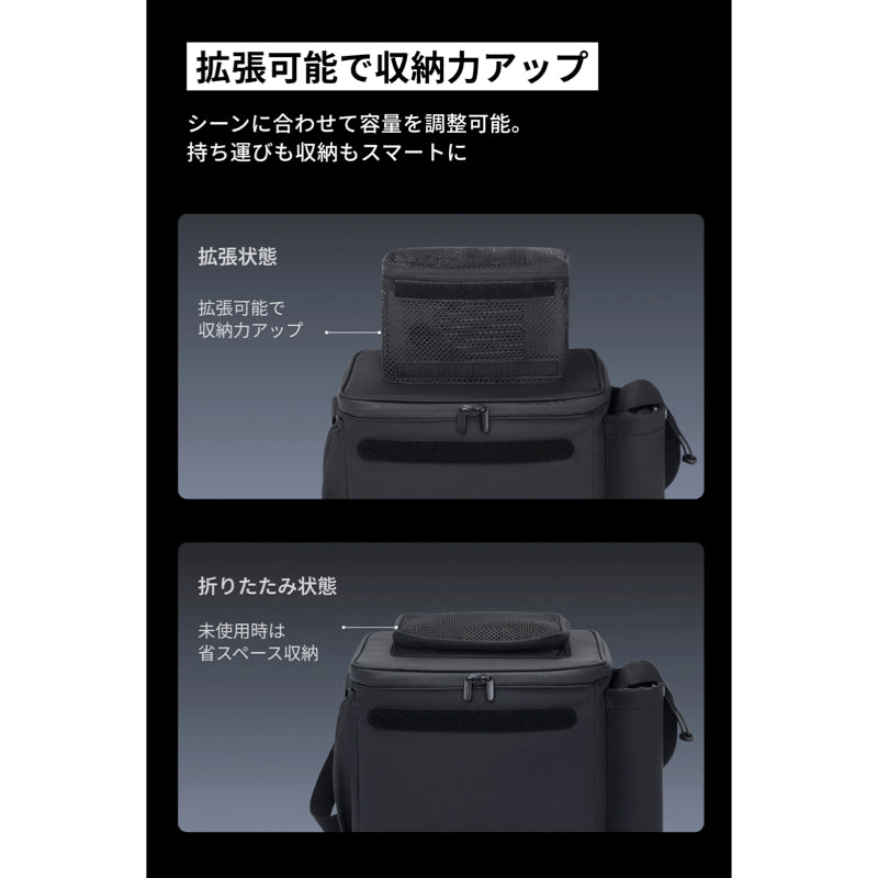 シーンに合わせて容量を調整。ストラップ付きで持ち運びも簡単。持ち運びも収納もスマートに。