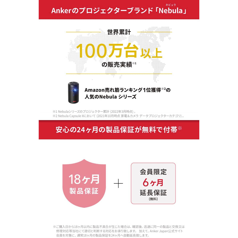 | パッケージ内容 | Nebula Nova、ランプシェード、引掛シーリング用専用アダプタ、リモコン (単4形電池×2付属) 、取扱説明書、18ヶ月保証 + 6ヶ月 (Ankerで会員登録後) 、カスタマーサポート |
