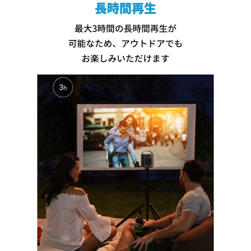 | ソフトウェア | OS:Android 7.1 動作モード:プロジェクターモード、Bluetoothスピーカーモード OTA:サポート アプリストア:サポート 動画再生時間:約3時間 (バッテリーモード使用時) 音楽再生時間:約30時間 (Bluetoothスピーカーモード使用時) 充電時間:約3時間 |