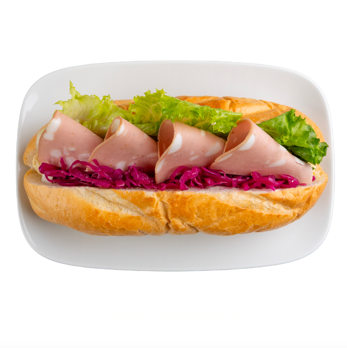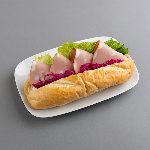 イタリア伝統的なハム「モルタデッラ」と、クリーミーでスパイシーな風味のひよこ豆のペースト「フムス」を挟んだサンドイッチです。香ばしいパンとの相性が抜群で、ひと口ごとに深い味わいが広がる、上品で満足感のある一品です。