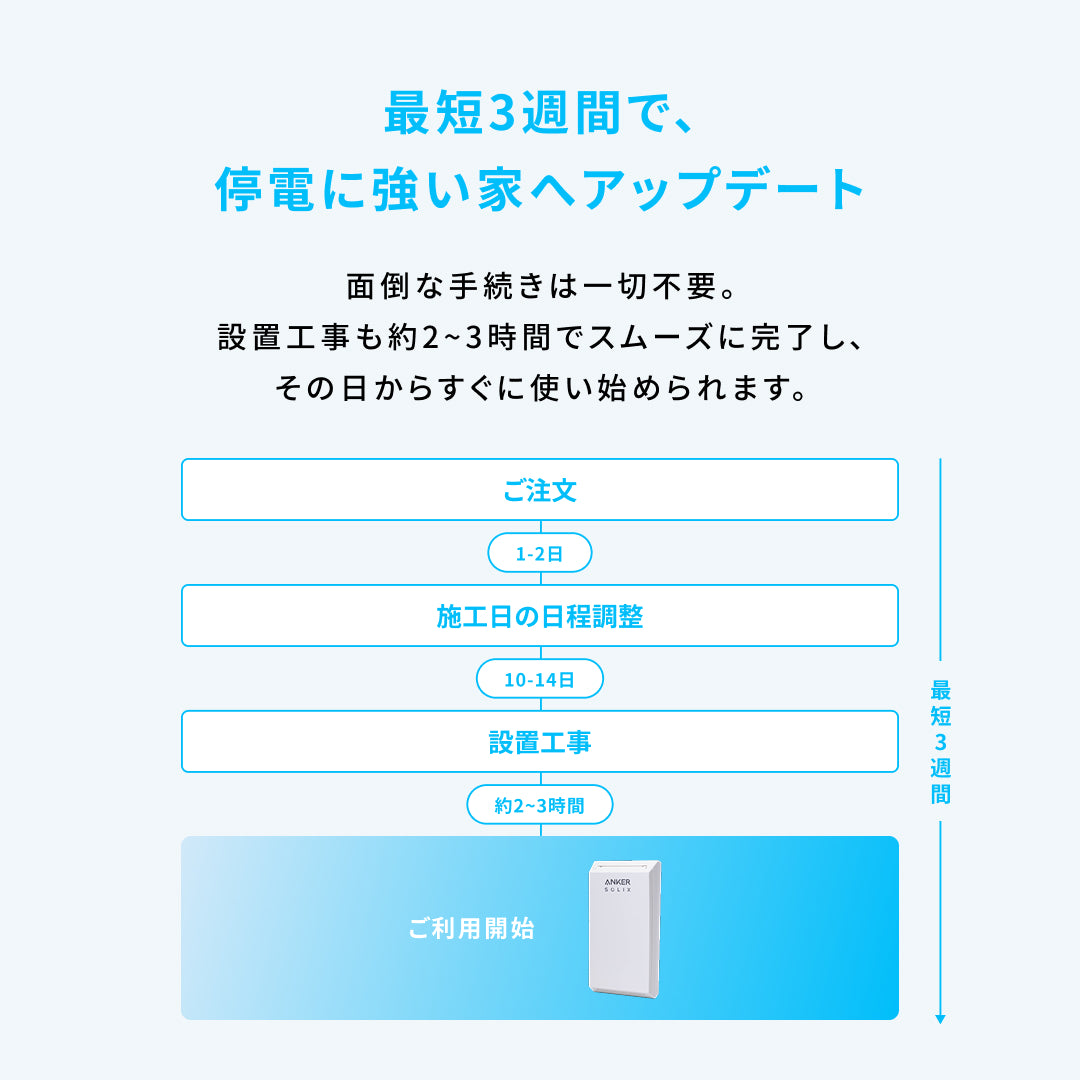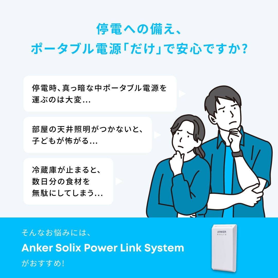 | ご注意 | ・本製品(切替分電盤)の設置にあたり、メイン分電盤(ブレーカー)の左右または上下に横幅21cm程度、高さ40cm程度のスペースを確保いただく必要がございます。 ・ポータブル電源を設置する場所はメイン分電盤(ブレーカー)から5m以下である必要がございます。※室内設置のみ対応 ・お客様のご自宅の構造などにより、ポータブル電源をご希望箇所に設置できない場合がございます。その場合は現地にてご相談の上、設置可能な場所へ設置位置を変更させていただく場合がございます。 ・作業時は回路確認の為にブレーカを落とす停電確認作業がございます。 ・Anker Solix Power Link Systemは容量1000Wh以上かつAC定格出力が1500W以上のポータブル電源に対応していますが、Anker製以外のポータブル電源は保証の対象外になります。 下記のAnker製ポータブル電源のご利用を推奨いたします。下記以外のポータブル電源のご利用を検討されている方は、Anker Solix Power Link Systemのご購入前にAnker Solix専用窓口までご連絡ください。 Anker Solix C1000 Gen 2 Portable Power Station Anker Solix C1000 Portable Power Station Anker Solix C2000 Gen 2 Portable Power Station Anker Solix F3000 Portable Power Station Anker 767 Portable Power Station ・沖縄の一部や離島・北海道札幌市から150kmを超える遠方地域は施工を承れません。 ・賃貸マンションまたはアパートの場合、退去時の原状回復費用はお客様ご負担になります。 |