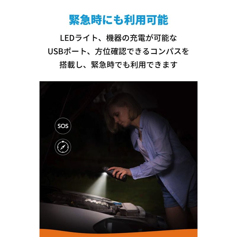 夜間でも役に立つLEDライト、スマートフォンの充電が可能な2つのUSBポート、方位を確認できるコンパス機能を搭載し、緊急時でも利用できます。2つのUSBポート