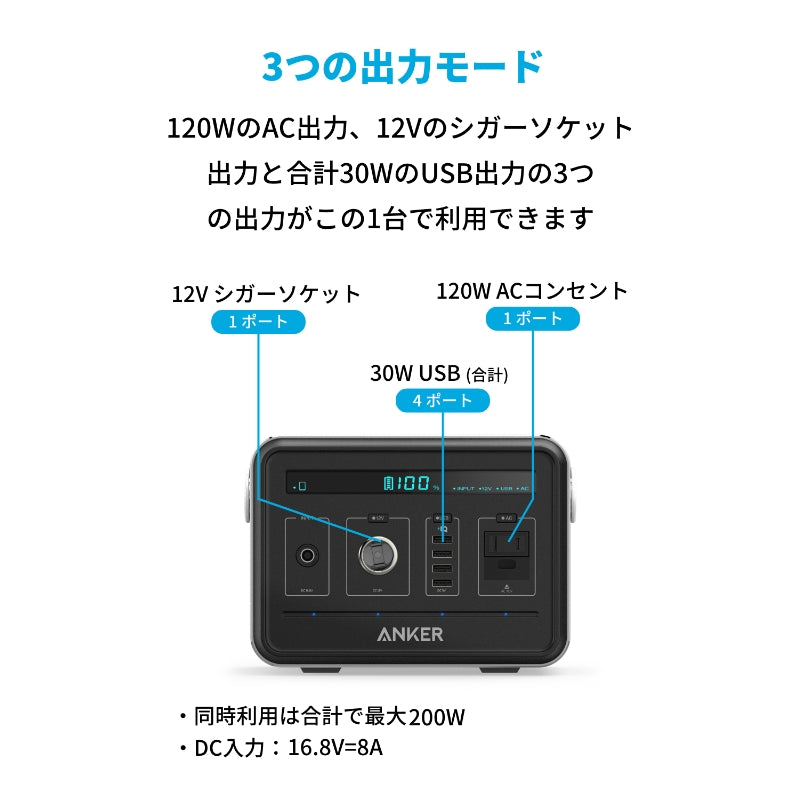 | 出力 | 【DC出力】12V=10A【AC出力】110V=1.09A【USB出力】5V=6A(各ポート最大2.4A) |