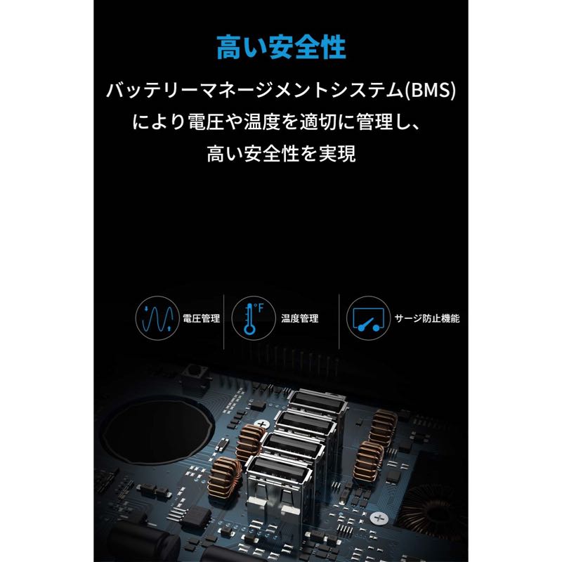 バッテリーマネージメントシステム(BMS)により電圧や温度を適切に管理し、ショートを予防することで、高い安全性を実現。また、アクティブ方式のセル・バランシングを採用することで、バッテリーのエネルギー効率を最適化すると同時に、バッテリーの寿命も長期化しています。安定したAC出力