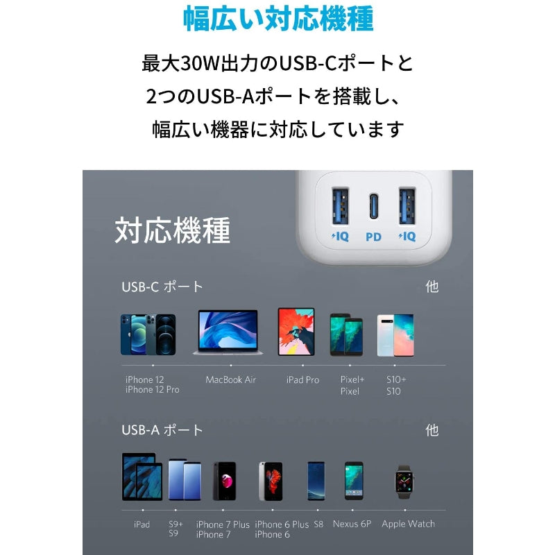 1つのUSB-Cポート、2つのUSB-Aポート、3つのコンセント差込口を搭載し、同時に6つの機器を充電可能です。最大30Wの急速充電