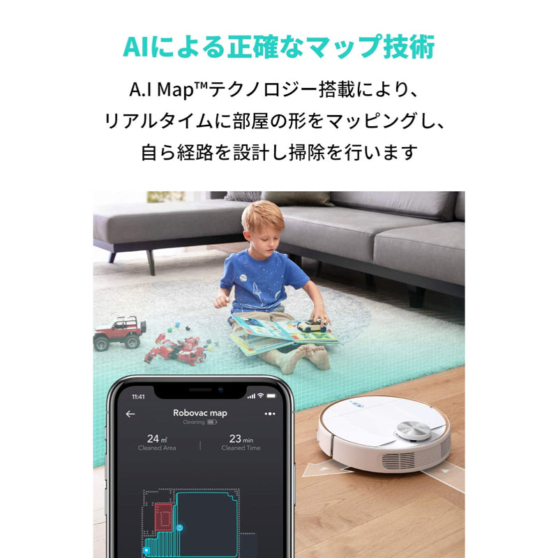 動作中リアルタイムに部屋の形をマッピングし、壁際など部屋の隅々まで念入りに掃除を⾏います。Eufy Cleanアプリに作成されたマップ上で「進⼊禁止エリア」「掃除強化エリア」「⽔拭き禁止エリア」の指定が可能です。