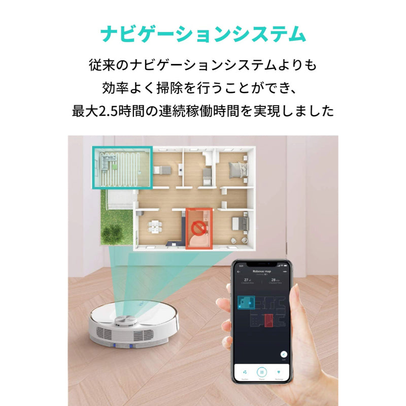 従来のナビゲーションシステムよりも効率よく掃除を⾏うことができるようになり、最⼤2.5時間の連続稼働時間を実現しました。