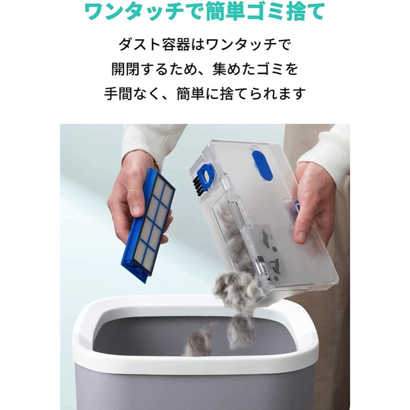 集めたゴミをワンタッチで手間なく簡単に捨てられます。ダスト容器とフィルターは水洗い可能なので、清潔に保てます。