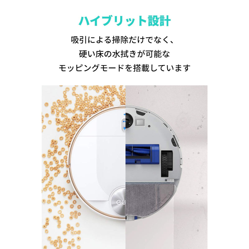 Eufy Cleanアプリと連携することで、掃除の開始/停止、掃除予約、吸引力の調整 (静音〜最大の4段階) 、モッピングモード時の水量調節 (3段階) 、進入禁止エリアや水拭き禁止エリア等の指定ができます。外出先での操作も可能です。